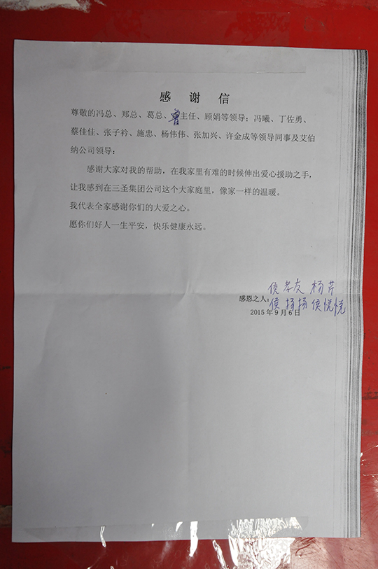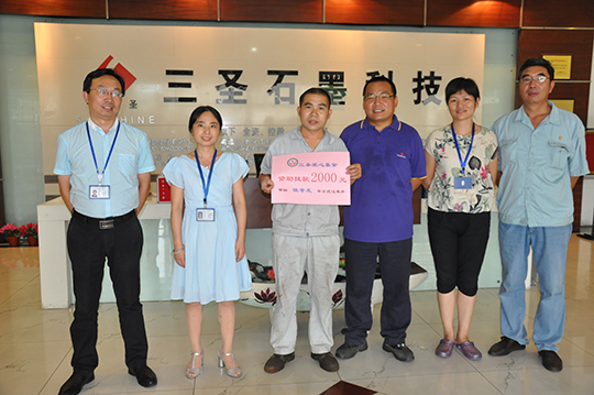 四、 董事長(zhǎng)親自捐贈(zèng)善款救助聽(tīng)到侯孝友的實(shí)際困難匯報(bào)后,董事長(zhǎng)非常關(guān)心,立即拿出私人款2000元現(xiàn)金資助,幫助侯孝友度過(guò)暫時(shí)的難關(guān)。鄭董還親自接待了侯孝友,詳細(xì)了解了他家庭目前的狀況,鼓勵(lì)他樹(shù)立信心,克服暫時(shí)困難,及時(shí)幫助妻子治療,引導(dǎo)兒女安心學(xué)習(xí),同時(shí),希望他在公司本職工作中繼續(xù)發(fā)揚(yáng)不拍苦、腳踏實(shí)地的精神,積極專(zhuān)研技能,不要辜負(fù)三圣愛(ài)心傳遞的希望。