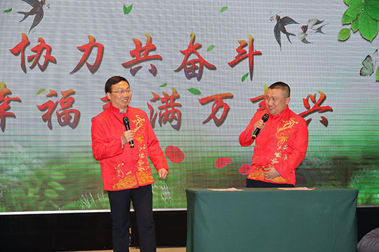 由阿彬主任、副總工阿杰自編自演的相聲《幸福三圣》,再現了洋溢在三圣集團大家庭中的濃濃幸福氛圍。這篇原創(chuàng)的相聲題材,傾注了編者的智慧和用心,巧妙將2018年度三圣大事件貫穿其中,詼諧幽默,“包袱”連連,獲得滿堂喝彩,兩位相聲演員也被贊“三圣德云社”;
