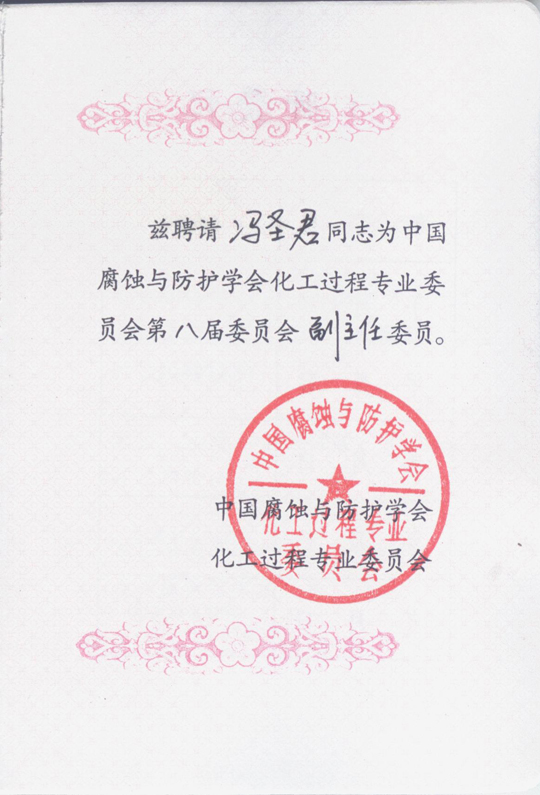 鑒于馮圣君在中國(guó)腐蝕與防護(hù)領(lǐng)域的杰出貢獻(xiàn)與不懈追求,中國(guó)腐蝕與防護(hù)學(xué)會(huì)經(jīng)過(guò)認(rèn)真考察,決定聘任其擔(dān)任化工過(guò)程專(zhuān)業(yè)委員會(huì)副主任,代表企業(yè)界參與學(xué)會(huì)工作。