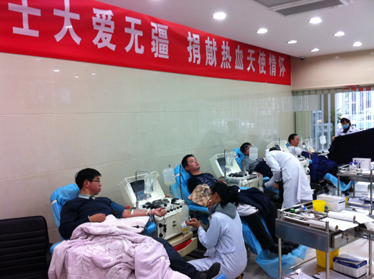 得知第一批獻(xiàn)血未成之后,員工中迅速自發(fā)組織第二批獻(xiàn)血員工,設(shè)計部戴尚權(quán)、狄陽,工程部陳健生,市場部周元明等五位員工在愛心基金會委員長魯沈彬的帶領(lǐng)之下,再次急赴獻(xiàn)血點。難能可貴的是,設(shè)計部狄陽、工程部的陳健生,進(jìn)入公司時間不長,與趙亞東尚未謀面,但是,他們卻急人所急,積極響應(yīng)倡議,毫不猶豫地參加了獻(xiàn)血。通過檢驗,最終魯沈彬、戴尚權(quán)、狄陽、周元明等四位同事符合捐獻(xiàn)成分血的要求,積極完成了獻(xiàn)血活動,為趙亞東提供了寶貴的四份用血指標(biāo)。