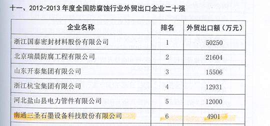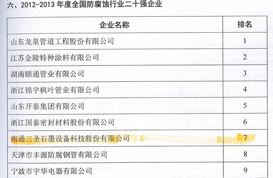 在剛剛閉幕的第五屆中國國際腐蝕控制大會(huì)上,南通三圣石墨設(shè)備科技股份有限公司憑借其優(yōu)異的業(yè)績(jī)榮登三大榜單,分別是:"2012-2013年度全國防腐蝕行業(yè)二十強(qiáng)企業(yè)"(排名第7位);"2012-2013年度全國非金屬壓力容器企業(yè)二十強(qiáng)"(排名第1位);"2012-2013年度全國防腐蝕行業(yè)外貿(mào)出口企業(yè)二十強(qiáng)"(排名第6位)。